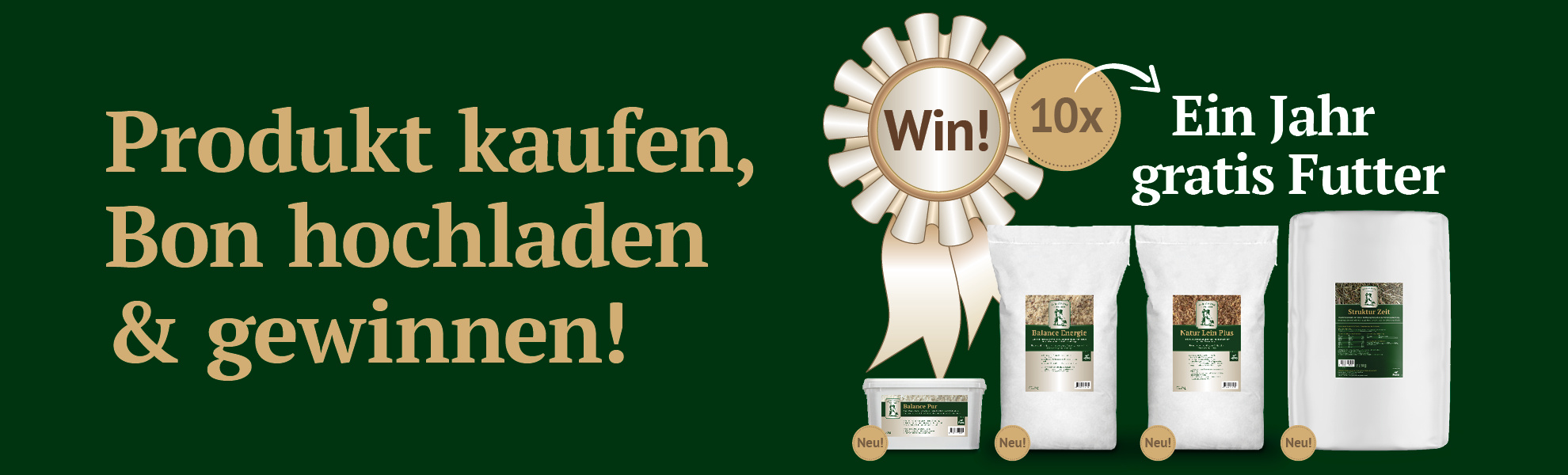 Kaufe mindestens eins der vier neuen Mühldorfer Produkte, lade deinen Beleg hoch und sichere dir deine Chance 1 von 10 Jahresvorräten Mühldorfer Pferdefutter zu gewinnen.