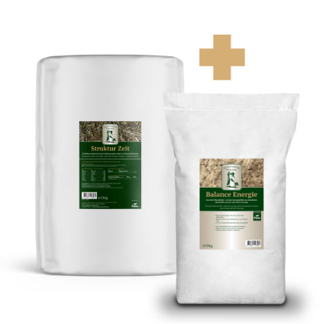 Die grobe, aber weich kaubare Struktur verlängert die Fresszeit, regt die Speichelbildung an und unterstützt so auf natürliche Weise die Verdauung und die Magenfunktion. Gleichzeitig dient Struktur Zeit als kalorienarmes Trägerfutter für Mineralfutter, Balancer oder andere Ergänzungsfuttermittel. Es ist auch ideal auch bei Diätpferden oder zur Beschäftigung, etwa wenn andere Pferde Kraftfutter erhalten.
