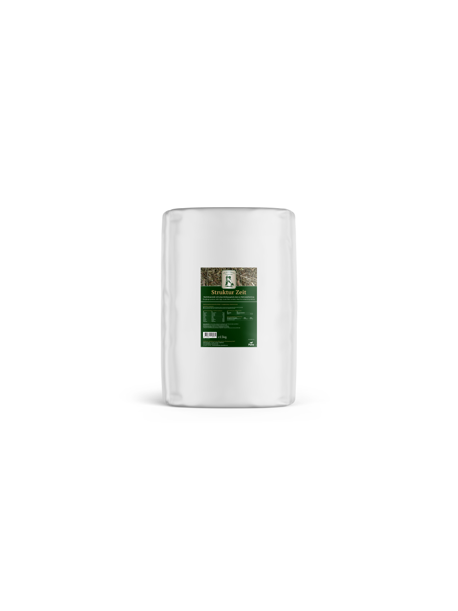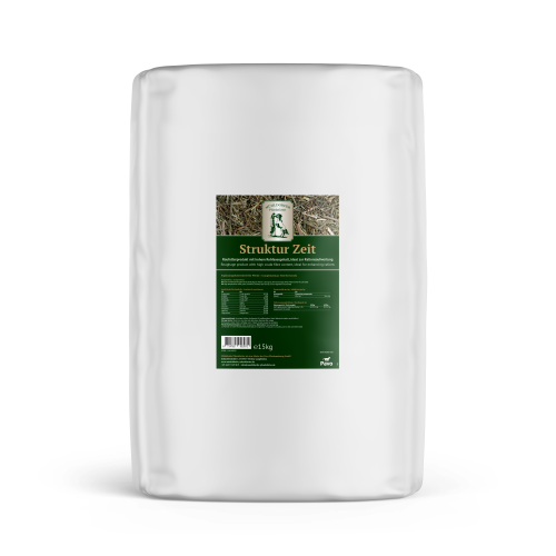 Die grobe, aber weich kaubare Struktur verlängert die Fresszeit, regt die Speichelbildung an und unterstützt so auf natürliche Weise die Verdauung und die Magenfunktion. Gleichzeitig dient Struktur Zeit als kalorienarmes Trägerfutter für Mineralfutter, Balancer oder andere Ergänzungsfuttermittel. Es ist auch ideal auch bei Diätpferden oder zur Beschäftigung, etwa wenn andere Pferde Kraftfutter erhalten.
